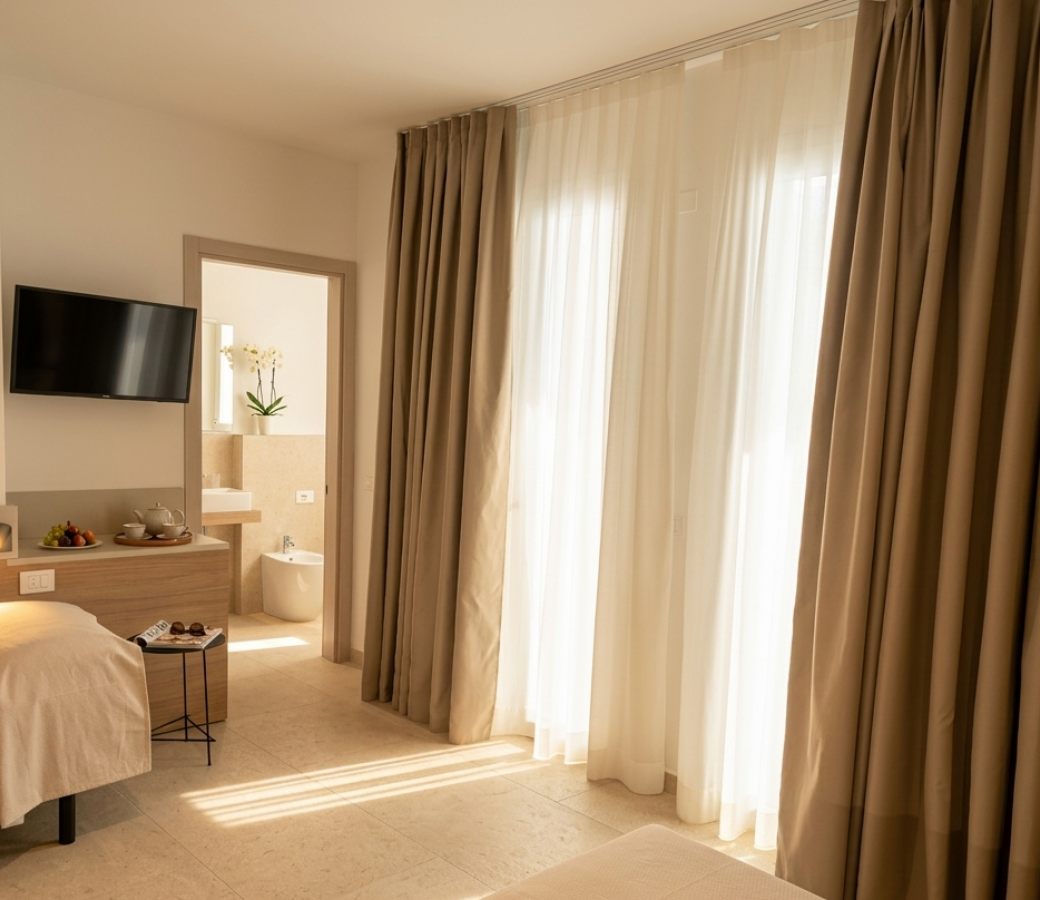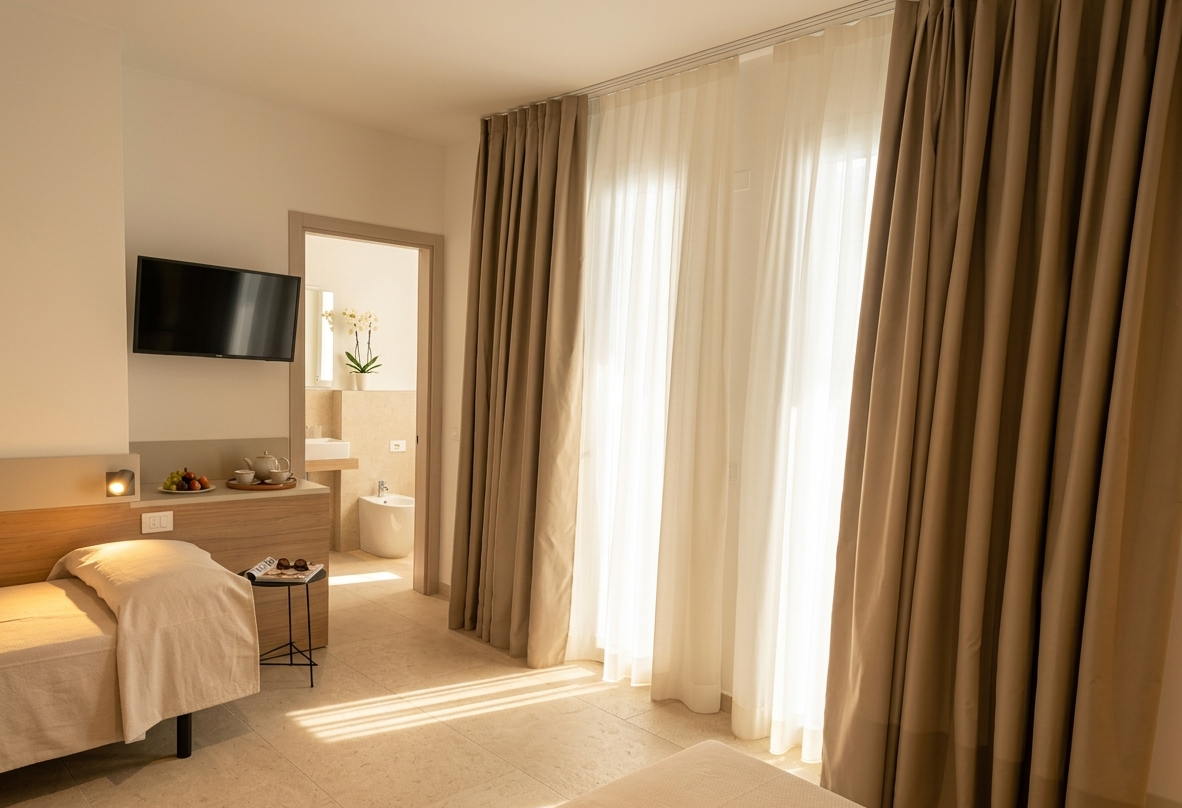 Le camere fronte mare dispongono di un ampio terrazzo, dove poter ammirare il mare nei diversi momenti della giornata mentre assume colori differenti, riflettendo la luce del sole, splendente di giorno e rosato al mattino.